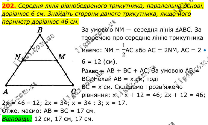 202. Середня лінія рівнобедреного трикутника, паралельна основі, дорівнює 6 см. Знайдіть сторони даного трикутника, якщо його периметр дорівнює 46 см. За умовою NM — середня лінія ∆АВС. За теоремою про середню лінію трикутника маємо: NМ = 1/2АС або АС = 2NM, АС = 2 • 6 = 12 (см). Р∆ABC = АВ + ВС + АС. За умовою АВ = ВС. Нехай АВ = х см, тоді ВС = х см. Складемо і розв’яжемо рівняння: х + х + 12 = 46; 2х + 12 = 46; 2х = 46 – 12; 2х = 34; х = 34 : 3; x = 17. Отже, маємо: АВ = ВС = 17 см. Відповідь: 12 см, 17 см, 17 см.
