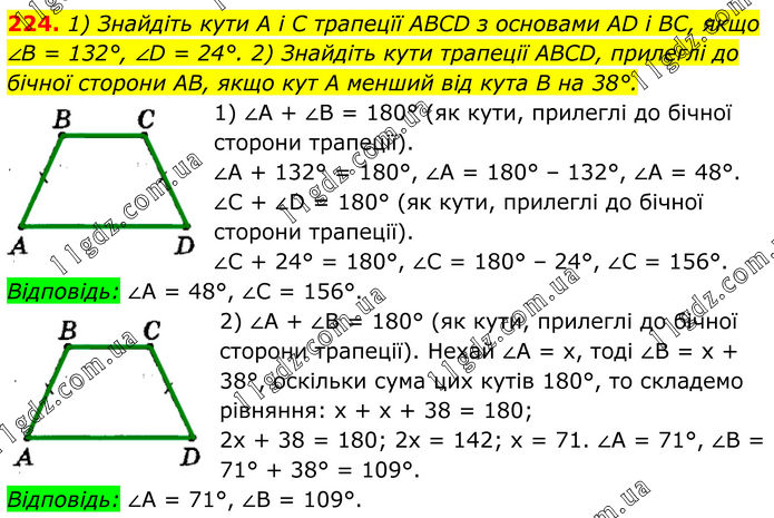 224. 1) Знайдіть кути A i C трапецїї ABCD з основами AD і BC, якщо ∠B = 132°, ∠D = 24°. 2) Знайдіть кути трапеції ABCD, прилеглі до бічної сторони AB, якщо кут А менший від кута В на 38°. 1) ∠А + ∠В = 180° (як кути, прилеглі до бічної сторони трапеції). ∠А + 132° = 180°, ∠А = 180° – 132°, ∠А = 48°. ∠С + ∠D = 180° (як кути, прилеглі до бічної сторони трапеції). ∠С + 24° = 180°, ∠С = 180° – 24°, ∠С = 156°. Відповідь: ∠А = 48°, ∠С = 156°. 2) ∠А + ∠В = 180° (як кути, прилеглі до бічної сторони трапеції). Нехай ∠А = х, тоді ∠В = х + 38°, оскільки сума цих кутів 180°, то складемо рівняння: х + х + 38 = 180; 2х + 38 = 180; 2х = 142; х = 71. ∠А = 71°, ∠В = 71° + 38° = 109°. Відповідь: ∠А = 71°, ∠В = 109°.