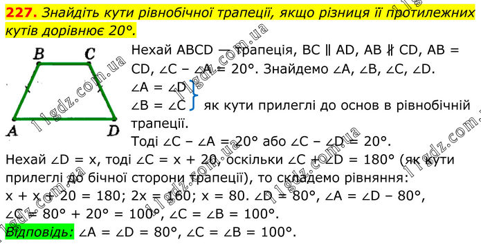 227. Знайдіть кути рівнобічної трапеції, якщо різниця її протилежних кутів дорівнює 20°. Нехай АВСD — трапеція, ВС ∥ АD, АВ ∦ СD, АВ = СD, ∠С – ∠А = 20°. Знайдемо ∠А, ∠В, ∠С, ∠D. ∠A = ∠D ∠B = ∠C як кути прилеглі до основ в рівнобічній трапеції. Тоді ∠С – ∠А = 20° або ∠С – ∠D = 20°. Нехай ∠D = х, тоді ∠С = х + 20, оскільки ∠С + ∠D = 180° (як кути прилеглі до бічної сторони трапеції), то складемо рівняння: х + х + 20 = 180; 2х = 160; x = 80. ∠D = 80°, ∠А = ∠D – 80°, ∠С = 80° + 20° = 100°, ∠С = ∠В = 100°. Відповідь: ∠А = ∠D = 80°, ∠С = ∠В = 100°.