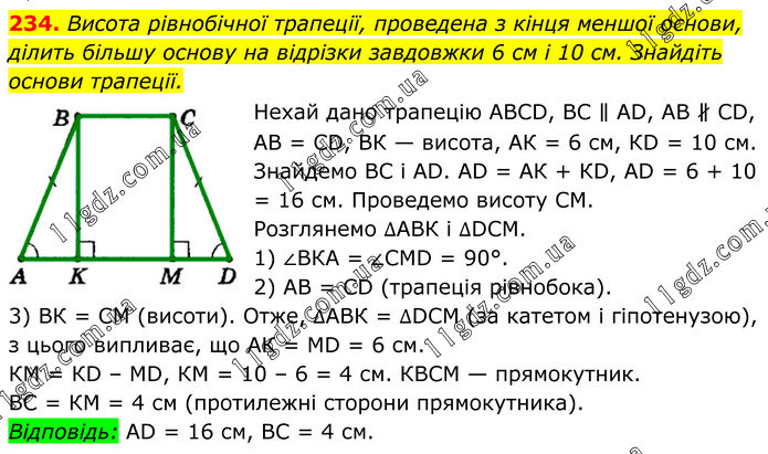 234. Висота рівнобічної трапеції, проведена з кінця меншої основи, ділить більшу основу на відрізки завдовжки 6 см і 10 см. Знайдіть основи трапеції. Нехай дано трапецію АВСD, ВС ∥ АD, АВ ∦ СD, АВ = СD, ВК — висота, АК = 6 см, КD = 10 см. Знайдемо ВС і АD. АD = АК + КD, АD = 6 + 10 = 16 см. Проведемо висоту СМ. Розглянемо ∆АВК і ∆DСМ. 1) ∠ВКА = ∠СМD = 90°. 2) АВ = СD (трапеція рівнобока). 3) ВК = СМ (висоти). Отже, ∆АВК = ∆DСМ (за катетом і гіпотенузою), з цього випливає, що АК = МD = 6 см. КМ = КD – МD, КМ = 10 – 6 = 4 см. КВСМ — прямокутник. ВС = КМ = 4 см (протилежні сторони прямокутника). Відповідь: АD = 16 см, ВС = 4 см.