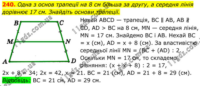 240. Одна з основ трапеції на 8 см більша за другу, а середня лінія дорівнює 17 см. Знайдіть основи трапеції. Нехай АВСD — трапеція, ВС ∥ АВ, АВ ∦ СD, АD > ВС на 8 см, МN — середня лінія, МN = 17 см. Знайдемо ВС і АВ. Нехай ВС = x (см), АD = х + 8 (см). За властивістю середньої лінії МN = (ВС + (АD) : 2. Оскільки МN = 17 см, то складемо рівняння: (х + x + 8) : 2 = 17, 2х + 8 = 34; 2х = 42, х = 21. ВС = 21 (см), АD = 21 + 8 = 29 (см). Відповідь: ВС = 21 см, АD = 29 см.