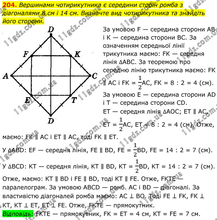 204. Вершинами чотирикутника є середини сторін ромба з діагоналями 8 см і 14 см. Визначте вид чотирикутника та знайдіть його сторони. За умовою F — середина сторони АВ і К — середина сторони ВС. За означенням середньої лінії трикутника маємо: FК — середня лінія ∆АВС. За теоремою про середню лінію трикутника маємо: FК ∥ АС і FК = 1/2АС, FК = 8 : 2 = 4 (см). За умовою Е — середина сторони АD і Т — середина сторони СD. ЕТ — середня лінія ∆АОС; ЕТ ∥ АС, ET = 1/2AC, ЕТ = 8 : 2 = 4 (см). Отже, маємо: FК ∥ АС і ЕТ ∥ AC, тоді FK ∥ ET. У ∆АВD: ЕF — середня лінія, FE ∥ ВD, FE = 1/2BD, FE = 14 : 2 = 7 (см). У ∆ВСD: KT — середня лінія, KT ∥ ВD, KT = 1/2ВD, KT = 14 : 2 = 7 (см). Отже, маємо: КТ ∥ ВD і FЕ ∥ ВD, тоді КТ ∥ FЕ. Отже, FКТЕ — паралелограм. За умовою АВСD — ромб. АС і ВD — діагоналі. За властивістю діагоналей ромба маємо: АС ⊥ ВО. Тоді FЕ ⊥ FK, FК ⊥ КТ, КТ ⊥ ЕТ, ЕТ ⊥ FЕ. Отже, FКТЕ — прямокутник. Відповідь: FКТЕ — прямокутник, FK = ЕТ = 4 см, КТ = FЕ = 7 см.