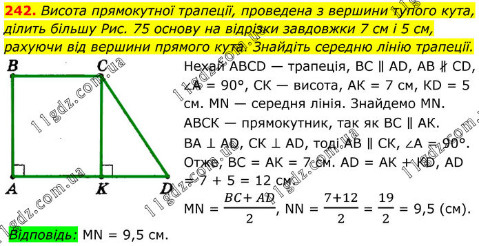242. Висота прямокутної трапеції, проведена з вершини тупого кута, ділить більшу Рис. 75 основу на відрізки завдовжки 7 см і 5 см, рахуючи від вершини прямого кута. Знайдіть середню лінію трапеції. Нехай АВСD — трапеція, ВС ∥ АD, АВ ∦ СD, ∠А = 90°, СК — висота, АК = 7 см, КD = 5 см. МN — середня лінія. Знайдемо МN. АВСК — прямокутник, так як ВС ∥ АК. ВА ⊥ АD, СК ⊥ АD, тоді АВ ∥ СК, ∠А = 90°. Отже, ВС = АК = 7 см. АD = АК + КD, АD = 7 + 5 = 12 см. МN = (BC+ AD)/2, NN = (7+12)/2 = 19/2 = 9,5 (см). Відповідь: МN = 9,5 см.