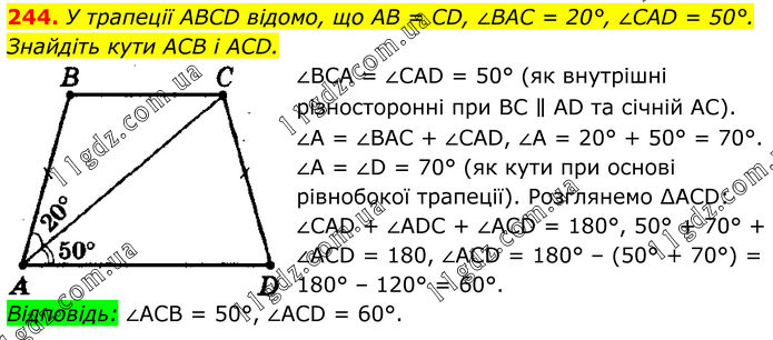 244. У трапеції ABCD відомо, що AB = CD, ∠BAC = 20°, ∠CAD = 50°. Знайдіть кути ACB і ACD. ∠ВСА = ∠САD = 50° (як внутрішні різносторонні при ВС ∥ АD та січній АС). ∠А = ∠ВАС + ∠САD, ∠A = 20° + 50° = 70°. ∠А = ∠D = 70° (як кути при основі рівнобокої трапеції). Розглянемо ∆АСD: ∠CAD + ∠ADC + ∠ACD = 180°, 50° + 70° + ∠АСD = 180, ∠АСD = 180° – (50° + 70°) = 180° – 120° = 60°. Відповідь: ∠АСВ = 50°, ∠АСD = 60°.