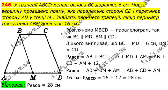 246. У трапеції ABCD менша основа BC дорівнює 6 см. Через вершину проведено пряму, яка паралельна стороні CD і перетинає сторону AD у точці M . Знайдіть периметр трапеції, якщо периметр трикутника ABM дорівнює 16 см. Розглянемо МВСD — паралелограм, так як ВС ∥ MD, ВМ ∥ СD. З цього випливає, що ВС = МD = 6 см, ВМ = СD. РABCD = АВ + ВС + СD + МD + АМ = АВ + СВ + АМ + 12, РABCD = АВ + ВМ + АМ = AB + CD + AM = 16 см; РABCD = 16 + 12 = 28 см. Відповідь: РABCD = 28 см.