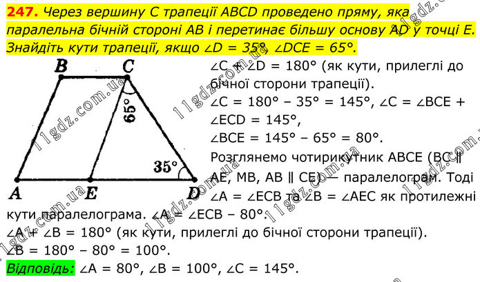 247. Через вершину C трапеції ABCD проведено пряму, яка паралельна бічній стороні AB і перетинає більшу основу AD у точці Е. Знайдіть кути трапеції, якщо ∠D = 35°, ∠DCE = 65°. ∠C + ∠D = 180° (як кути, прилеглі до бічної сторони трапеції). ∠C = 180° – 35° = 145°, ∠C = ∠ВСЕ + ∠ЕСD = 145°, ∠ВСЕ = 145° – 65° = 80°. Розглянемо чотирикутник АВСЕ (ВС ∥ АЕ, МВ, АВ ∥ СЕ) — паралелограм. Тоді ∠А = ∠ЕСВ та ∠В = ∠АЕС як протилежні кути паралелограма. ∠A = ∠ЕСВ – 80°. ∠A + ∠В = 180° (як кути, прилеглі до бічної сторони трапеції). ∠В = 180° – 80° = 100°. Відповідь: ∠А = 80°, ∠В = 100°, ∠С = 145°.
