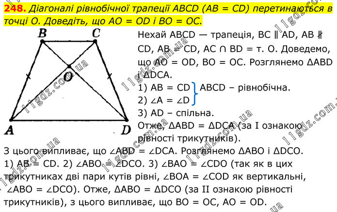 248. Діагоналі рівнобічної трапеції ABCD (AB = CD) перетинаються в точці О. Доведіть, що AO = OD і BO = ОС. Нехай АВСD — трапеція, ВС ∥ АD, АВ ∦ СD, АВ = СD, АС ∩ BD = т. О. Доведемо, що АО = ОD, ВО = ОС. Розглянемо ∆АВD і ∆DСА. 1) АВ = СD ABCD – рівнобічна. 2) ∠А = ∠D 3) AD – спільна. Отже, ∆АВD = ∆DСА (за І ознакою рівності трикутників). З цього випливає, що ∠АВD = ∠DСА. Розглянемо ∆АВО і ∆DСО. 1) АВ = СD. 2) ∠АВО = ∠DСО. 3) ∠ВАО = ∠СDО (так як в цих трикутниках дві пари кутів рівні, ∠ВОА = ∠СОD як вертикальні, ∠ABO = ∠DСО). Отже, ∆АВО = ∆DСО (за II ознакою рівності трикутників), з цього випливає, що ВО = ОС, АО = ОD.
