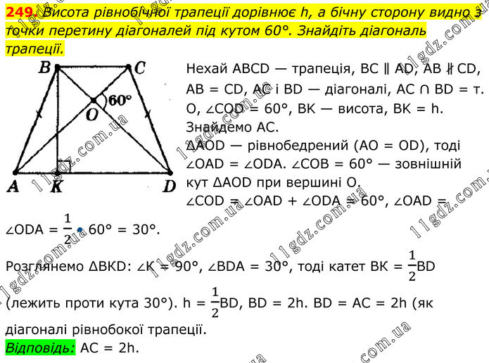 249. Висота рівнобічної трапеції дорівнює h, а бічну сторону видно з точки перетину діагоналей під кутом 60°. Знайдіть діагональ трапеції. Нехай АВСD — трапеція, ВС ∥ АD, АВ ∦ СD, АВ = СD, АС і ВD — діагоналі, АС ∩ ВD = т. О, ∠СОD = 60°, ВK — висота, ВK = h. Знайдемо АС. ∆AОD — рівнобедрений (АО = ОD), тоді ∠ОАD = ∠ОDА. ∠СОВ = 60° — зовнішній кут ∆АОD при вершині О. ∠COD = ∠ОАD + ∠ОDА = 60°, ∠ОАD = ∠ОDА = 1/2 • 60° = 30°. Розглянемо ∆ВКD: ∠К = 90°, ∠ВDА = 30°, тоді катет ВК = 1/2ВD (лежить проти кута 30°). h = 1/2ВD, ВD = 2h. ВD = АС = 2h (як діагоналі рівнобокої трапеції. Відповідь: AC = 2h.