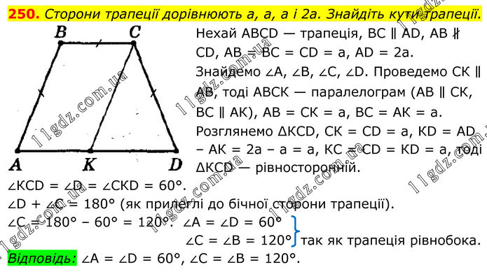 250. Сторони трапеції дорівнюють а, а, а і 2а. Знайдіть кути трапеції. Нехай АВСD — трапеція, ВС ∥ АD, АВ ∦ СD, АВ = ВС = СD = a, АD = 2а. Знайдемо ∠А, ∠В, ∠С, ∠D. Проведемо СК ∥ АВ, тоді АВСК — паралелограм (АВ ∥ СК, ВС ∥ АК), АВ = СК = а, ВС = АК = а. Розглянемо ∆КСD, СК = СD = а, КD = АD – АК = 2а – а = а, КС = СD = КD = а, тоді ∆КСD — рівносторонній. ∠КСD = ∠D = ∠СКD = 60°. ∠D + ∠С = 180° (як прилеглі до бічної сторони трапеції). ∠С = 180° – 60° = 120°. ∠А = ∠D = 60° ∠C = ∠B = 120° так як трапеція рівнобока. Відповідь: ∠А = ∠D = 60°, ∠С = ∠В = 120°.
