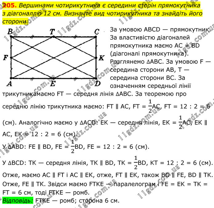 205. Вершинами чотирикутника є середини сторін прямокутника з діагоналлю 12 см. Визначте вид чотирикутника та знайдіть його сторони. За умовою АВСD — прямокутник. За властивістю діагоналей прямокутника маємо АС = ВD (діагоналі прямокутника). Розглянемо ∆АВС. За умовою F — середина сторони АВ, Т — середина сторони ВС. За означенням середньої лінії трикутникамаємо FТ — середня лінія ∆АВС. За теоремою про середню лінію трикутника маємо: FТ ∥ АС, FT = 1/2AC, FT = 12 : 2 = 6 (см). Аналогічно маємо у ∆АСD: ЕК — середня лінія, ЕК = 1/2АС, ЕК ∥ АС, ЕК = 12 : 2 = 6 (см). У ∆АВD: FЕ ∥ ВD, FE = 1/2BD, FE = 12 : 2 = 6 (см). У ∆ВСD: ТК — середня лінія, ТК ∥ ВD, TK = 1/2BD, KT = 12 : 2 = 6 (см). Отже, маємо АС ∥ FТ і АС ∥ ЕК, отже, FТ ∥ ЕК, також ВD ∥ FЕ, ВD ∥ ТК. Отже, FЕ ∥ ТК. Звідси маємо FТKE — паралелограм і FE = ЕK = ТK = FТ = 6 см, тоді FТKЕ — ромб. Відповідь: FТКЕ — ромб; сторона 6 см.