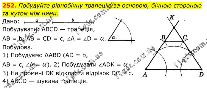 252. Побудуйте рівнобічну трапецію за основою, бічною стороною та кутом між ними. Дано: Побудувати: АВСD — трапеція, АВ = b, АВ = СD = с, ∠А = ∠D = α. Побудова. 1) Побудуємо ∆АBD (АD = b, АВ = с, ∠А = α). 2) Побудувати ∠АDК = α. 3) На промені DК відкласти відрізок DС = с. 4) АВСD — шукана трапеція.