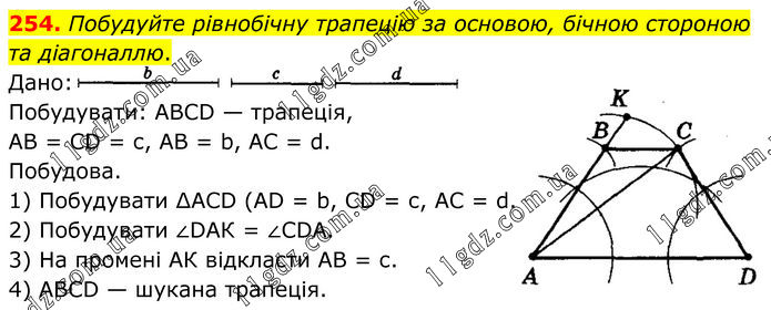 254. Побудуйте рівнобічну трапецію за основою, бічною стороною та діагоналлю. Дано: Побудувати: АВСD — трапеція, АВ = СD = с, АВ = b, АС = d. Побудова. 1) Побудувати ∆АСD (АD = b, СD = с, АС = d. 2) Побудувати ∠DАК = ∠СDА. 3) На промені АК відкласти АВ = с. 4) АВСD — шукана трапеція.
