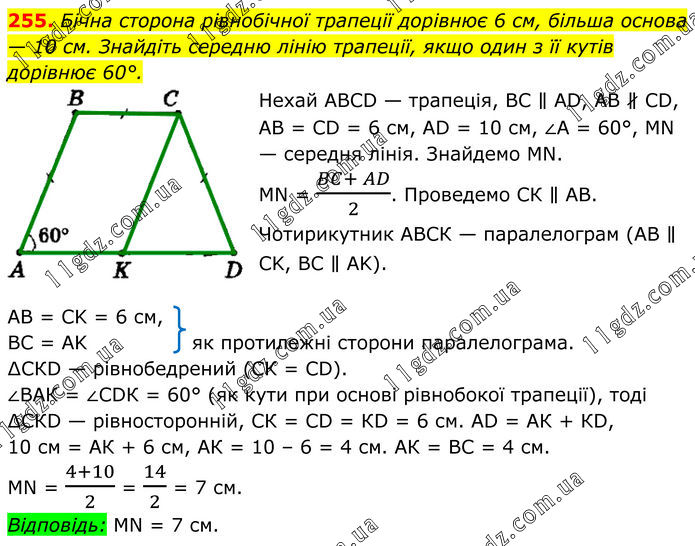 255. Бічна сторона рівнобічної трапеції дорівнює 6 см, більша основа — 10 см. Знайдіть середню лінію трапеції, якщо один з її кутів дорівнює 60°. Нехай АВСD — трапеція, ВС ∥ АD, АВ ∦ СD, АВ = СD = 6 см, АD = 10 см, ∠А = 60°, МN — середня лінія. Знайдемо MN. МN = (BC+ AD)/2. Проведемо СК ∥ АВ. Чотирикутник АВСК — паралелограм (АВ ∥ СK, BC ∥ AK). АВ = СK = 6 см, ВС = АK як протилежні сторони паралелограма. ∆СКD — рівнобедрений (СК = СD). ∠ВАК = ∠СDК = 60° (як кути при основі рівнобокої трапеції), тоді ∆СКD — рівносторонній, СК = СD = КD = 6 см. АD = АК + КD, 10 см = АК + 6 см, АК = 10 – 6 = 4 см. АК = ВС = 4 см. MN = (4+10)/2 = 14/2 = 7 см. Відповідь: МN = 7 см.
