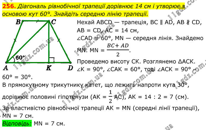 256. Діагональ рівнобічної трапеції дорівнює 14 см і утворює з основою кут 60°. Знайдіть середню лінію трапеції. Нехай АВСD — трапеція, ВС ∥ АD, АВ ∦ СD, АВ = CD, AC = 14 см, ∠САD = 60°, МN — середня лінія. Знайдемо МN. МN = (BC+ AD)/2. Проведемо висоту СК. Розглянемо ∆АСК. ∠K = 90°, ∠CAK = 60°, тоді ∠ACK = 90° – 60° = 30°. В прямокутному трикутнику катет, що лежить напроти кута 30°, дорівнює половині гіпотенузи (АК = 1/2 АС), АК = 14 : 2 = 7 (см). За властивістю рівнобічної трапеції АК = МN (середні лінії трапеції), МN = 7 см. Відповідь: МN = 7 см.