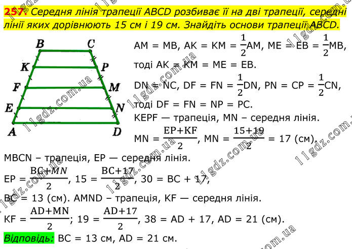 257. Середня лінія трапеції ABCD розбиває її на дві трапеції, середні лінії яких дорівнюють 15 см і 19 см. Знайдіть основи трапеції ABCD. AM = MB, AK = KM = 1/2AM, ME = EB = 1/2MB, тоді AK = KM = ME = EB. DN = NC, DF = FN = 1/2DN, PN = CP = 1/2CN, тоді DF = FN = NP = PC. KEPF — трапеція, MN – середня лінія. MN = (EP+KF)/2, MN = (15+19)/2 = 17 (см). MBCN – трапеція, EP — середня лінія. EP = (BC+MN)/2, 15 = (BC+17)/2, 30 = BC + 17, ВС = 13 (см). AMND – трапеція, KF — середня лінія. КF = (AD+MN)/2; 19 = (AD+17)/2, 38 = AD + 17, AD = 21 (см). Відповідь: ВС = 13 см, АD = 21 см.