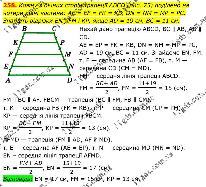258. Кожну з бічних сторін трапеції ABCD (рис. 75) поділено на чотири рівні частини: AE = EF = FK = KB, DN = NM = MP = PC. Знайдіть відрізки EN , FM і KP, якщо AD = 19 см, BC = 11 см. Нехай дано трапецію АВСD, ВС ∥ АВ, АВ ∦ СD. АЕ = ЕР = FК = КВ, DN = NМ = МР = РС, АD = 19 см, ВС = 11 см. Знайдемо ЕN, FМ. т. F — середина АВ (АF = FВ), т. M — середина СD (СМ = МD). FМ — середня лінія трапеції АВСD. FМ = (BC+ AD)/2, FM = (11+19)/2 = 15 (см). FM ∥ ВС ∥ АF. FВСМ — трапеція (ВС ∥ FМ, FВ ∦ СМ). т. K — середина FВ (FK = КВ), т. Р — середина СМ (СР = РМ). КР — середня лінія трапеції FВСМ. КР = (BC+ FM)/2, KP = (11+15)/2 = 13 (см). АFМD — трапеція (FМ ∥ АD, АF ∦ МD). т. E — середина АF (АЕ = ЕР), т. N — середина МD (МN = ND). ЕN – середня лінія трапеції АFМD. ЕN = (FM+ AD)/2, EN = (15+19)/2 = 17 (см). Відповідь: ЕN = 17 см, FМ = 15 см, КР = 13 см.