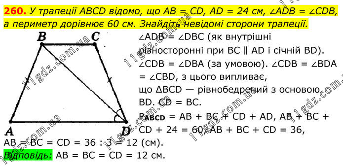 260. У трапеції ABCD відомо, що AB = CD, AD = 24 см, ∠ADB = ∠CDB, а периметр дорівнює 60 см. Знайдіть невідомі сторони трапеції. ∠АDВ = ∠DВС (як внутрішні різносторонні при ВС ∥ АD і січній ВD). ∠СDВ = ∠DВА (за умовою). ∠СDВ = ∠BDА = ∠СBD, з цього випливає, що ∆ВСD — рівнобедрений з основою ВD. СD = ВС. РАВСD = АВ + ВС + СD + АD, АВ + ВС + СD + 24 = 60, АВ + ВС + СD = 36, АВ = ВС = СD = 36 : 3 = 12 (см). Відповідь: АВ = ВС = СD = 12 см.