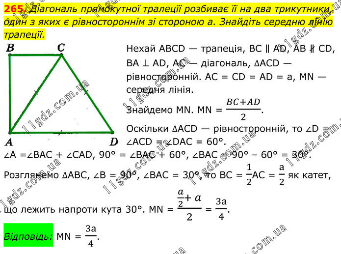 265. Діагональ прямокутної тралецїї розбиває її на два трикутники, один з яких є рівностороннім зі стороною а. Знайдіть середню лінію трапецїї. Нехай АВСD — трапеція, ВС ∥ АD, АВ ∦ СD, ВА ⊥ АD, АС — діагональ, ∆АСD — рівносторонній. АС = СD = АD = а, МN — середня лінія. Знайдемо МN. MN = (BC+AD)/2. Оскільки ∆АСD — рівносторонній, то ∠D = ∠АСD = ∠DАС = 60°. ∠А =∠ВАС + ∠САD, 90° = ∠ВАС + 60°, ∠ВАС = 90° – 60° = 30°. Розглянемо ∆АВС, ∠В = 90°, ∠ВАС = 30°, то ВС = 1/2АС = a/2 як катет, що лежить напроти кута 30°. МN = (a/2+ a)/2 = 3a/4. Відповідь: МN = 3a/4.