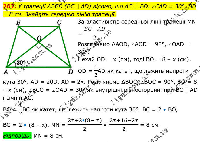 267. У трапеції ABCD (BC ∥ AD) відомо, що AC ⊥ BD, ∠CAD = 30°, BD = 8 см. Знайдіть середню лінію трапеції. За властивістю середньої лінії трапеції МN = (BC+ AD)/2. Розглянемо ∆АОD, ∠АОD = 90°, ∠ОАD = 30°. Нехай ОD = х (см), тоді ВО = 8 – х (см). ОD = 1/2АD як катет, що лежить напроти кута 30°. АD = 20D, АD = 2х. Розглянемо ∆ВОС, ∠ВОС = 90°, ВО = 8 – х (см), ∠ВСО = ∠ОАD = 30° як внутрішні різносторонні при ВС ∥ АD і січній АС. ВО = 1/2ВС як катет, що лежить напроти кута 30°. ВС = 2 • BO, ВС = 2 • (8 – х). МN = (2x+2•(8- x))/2 = (2x+16-2x)/2 = 8 см. Відповідь: МN = 8 см.