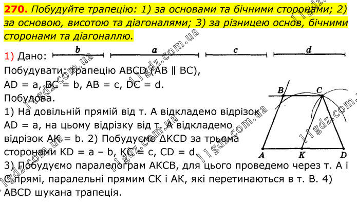 270. Побудуйте трапецію: 1) за основами та бічними сторонами; 2) за основою, висотою та діагоналями; 3) за різницею основ, бічними сторонами та діагоналлю. 1) Дано: Побудувати: трапецію АВСD (АВ ∥ ВС), АD = а, ВС = b, АВ = с, DС = d. Побудова. 1) На довільній прямій від т. А відкладемо відрізок АD = а, на цьому відрізку від т. А відкладемо відрізок АК = b. 2) Побудуємо ∆KCD за трьома сторонами КD = а – b, КС = с, СD = d. 3) Побудуємо паралелограм АКСВ, для цього проведемо через т. А і C прямі, паралельні прямим СК і АК, які перетинаються в т. В. 4) АВСD шукана трапеція.