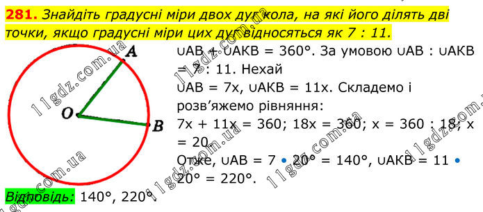 281. Знайдіть градусні міри двох дуг кола, на які його ділять дві точки, якщо градусні міри цих дуг відносяться як 7 : 11. ∪АВ + ∪АКВ = 360°. За умовою ∪АВ : ∪АКВ = 7 : 11. Нехай ∪АВ = 7х, ∪АКВ = 11х. Складемо і розв’яжемо рівняння: 7х + 11х = 360; 18х = 360; х = 360 : 18; х = 20. Отже, ∪АВ = 7 • 20° = 140°, ∪АКВ = 11 • 20° = 220°. Відповідь: 140°, 220°.