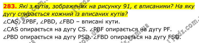 283. Які з кутів, зображених на рисунку 91, є вписаними? На яку дугу спирається кожний із вписаних кутів? ∠CAS, ∠PBF, ∠PBD, ∠FBD – вписані кути. ∠CAS опирається на дугу CS. ∠PBF опирається на дугу PF. ∠PBD опирається на дугу PSD. ∠FBD опирається на дугу FSD.