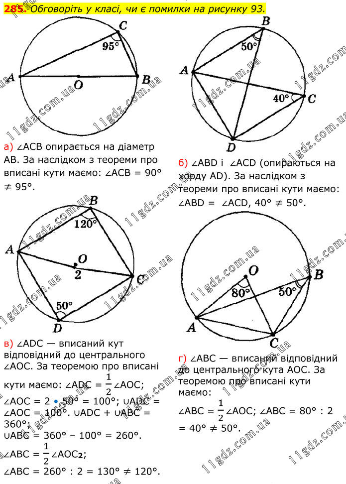 285. Обговоріть у класі, чи є помилки на рисунку 93. а) ∠АСВ опирається на діаметр АВ. За наслідком з теореми про вписані кути маємо: ∠АСВ = 90° ≠ 95°. в) ∠АDС — вписаний кут відповідний до центрального ∠АОС. За теоремою про вписані кути маємо: ∠АDС = 1/2∠АОС; ∠АОС = 2 • 50° = 100°; ∪АDС = ∠АОС = 100°. ∪АDС + ∪АВС = 360°; ∪АВС = 360° – 100° = 260°. ∠АВС = 1/2∠АОС2; ∠АВС = 260° : 2 = 130° ≠ 120°. б) ∠АВD і ∠АСD (опираються на хорду АD). За наслідком з теореми про вписані кути маємо: ∠АBD = ∠АСD, 40° ≠ 50°. г) ∠АВС — вписаний відповідний до центрального кута АОС. За теоремою про вписані кути маємо: ∠АВС = 1/2∠АОС; ∠АВС = 80° : 2 = 40° ≠ 50°.