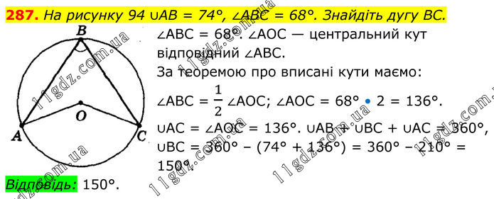 287. На рисунку 94 ∪AB = 74°, ∠ABC = 68°. Знайдіть дугу BC. ∠ABC = 68°. ∠AOC — центральний кут відповідний ∠ABC. За теоремою про вписані кути маємо: ∠ABC = 1/2 ∠AOC; ∠AOC = 68° • 2 = 136°. ∪АС = ∠AОС = 136°. ∪АВ + ∪ВС + ∪АС = 360°, ∪ВС = 360° – (74° + 136°) = 360° – 210° = 150°. Відповідь: 150°.