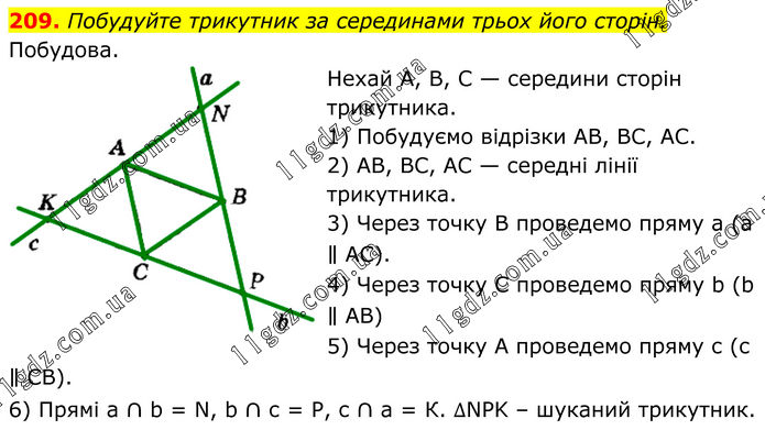 209. Побудуйте трикутник за серединами трьох його сторін. Побудова. Нехай А, В, С — середини сторін трикутника. 1) Побудуємо відрізки АВ, ВС, АС. 2) АВ, ВС, АС — середні лінії трикутника. 3) Через точку В проведемо пряму а (а ∥ AC). 4) Через точку С проведемо пряму b (b ∥ AB) 5) Через точку А проведемо пряму с (с ∥ CB). 6) Прямі а ∩ b = N, b ∩ с = Р, с ∩ a = К. ∆NPK – шуканий трикутник.