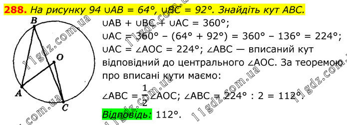 288. На рисунку 94 ∪AB = 64°, ∪BC = 92°. Знайдіть кут ABC. ∪АВ + ∪ВС + ∪АС = 360°; ∪АС = 360° – (64° + 92°) = 360° – 136° = 224°; ∪АС = ∠AOC = 224°; ∠АВС — вписаний кут відповідний до центрального ∠AOC. За теоремою про вписані кути маємо: ∠ABC = 1/2∠AOC; ∠ABC = 224° : 2 = 112°. Відповідь: 112°.