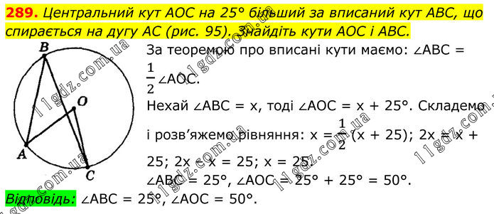 289. Центральний кут AOC на 25° більший за вписаний кут ABC, що спирається на дугу AC (рис. 95). Знайдіть кути AOC і ABC. За теоремою про вписані кути маємо: ∠ABC = 1/2∠AOC. Нехай ∠АВС = x, тоді ∠AOC = х + 25°. Складемо і розв’яжемо рівняння: x = 1/2 (x + 25); 2x = x + 25; 2x – x = 25; x = 25. ∠ABC = 25°, ∠AOC = 25° + 25° = 50°. Відповідь: ∠ABC = 25°, ∠АОС = 50°.