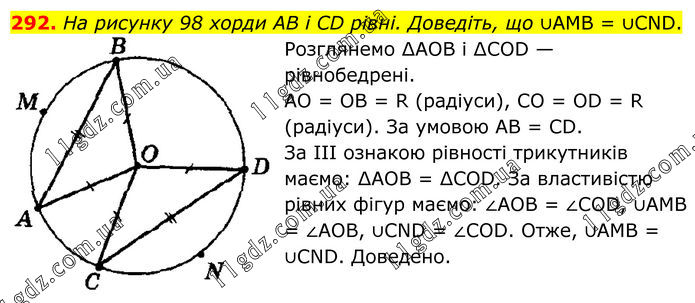 292. На рисунку 98 хорди АВ і CD рівні. Доведіть, що ∪AMВ = ∪CND. Розглянемо ∆АОВ і ∆COD — рівнобедрені. AO = OB = R (радіуси), CO = OD = R (радіуси). За умовою АВ = CD. За III ознакою рівності трикутників маємо: ∆АОВ = ∆COD. За властивістю рівних фігур маємо: ∠АОВ = ∠COD, ∪AMВ = ∠АОВ, ∪CND = ∠COD. Отже, ∪AMB = ∪CND. Доведено.