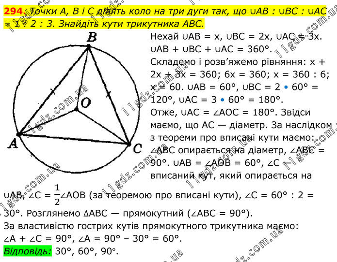 294. Точки А, В і C ділять коло на три дуги так, що ∪AB : ∪BC : ∪AC = 1 : 2 : 3. Знайдіть кути трикутника ABC. Нехай ∪АВ = х, ∪ВС = 2х, ∪АС = Зх. ∪АВ + ∪ВС + ∪АС = 360°. Складемо і розв’яжемо рівняння: х + 2х + Зх = 360; 6x = 360; x = 360 : 6; x = 60. ∪АВ = 60°, ∪ВС = 2 • 60° = 120°, ∪АС = 3 • 60° = 180°. Отже, ∪АС = ∠АОС = 180°. Звідси маємо, що АС — діаметр. За наслідком з теореми про вписані кути маємо: ∠АВС опирається на діаметр, ∠АВС = 90°. ∪AB = ∠АОВ = 60°, ∠С — вписаний кут, який опирається на ∪АВ, ∠С = 1/2∠АОВ (за теоремою про вписані кути), ∠С = 60° : 2 = 30°. Розглянемо ∆АВС — прямокутний (∠АВС = 90°). За властивістю гострих кутів прямокутного трикутника маємо: ∠А + ∠С = 90°, ∠А = 90° – 30° = 60°. Відповідь: 30°, 60°, 90°.