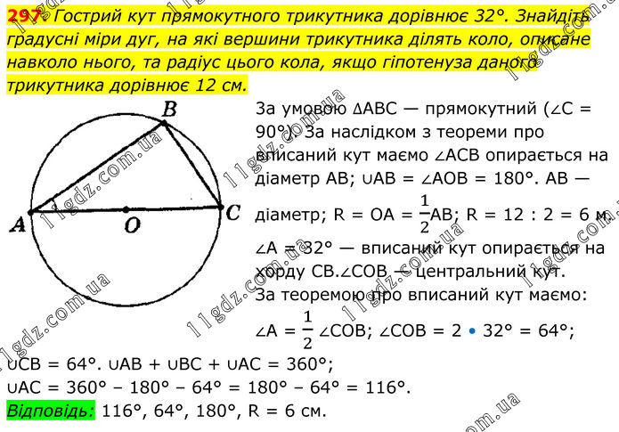 297. Гострий кут прямокутного трикутника дорівнює 32°. Знайдіть градусні міри дуг, на які вершини трикутника ділять коло, описане навколо нього, та радіус цього кола, якщо гіпотенуза даного трикутника дорівнює 12 см. 3a умовою ∆ABC — прямокутний (∠С = 90°). За наслідком з теореми про вписаний кут маємо ∠ACB опирається на діаметр АВ; ∪АВ = ∠AOB = 180°. АВ — діаметр; R = ОА = 1/2АВ; R = 12 : 2 = 6 м. ∠A = 32° — вписаний кут опирається на хорду СВ.∠COB — центральний кут. За теоремою про вписаний кут маємо: ∠A = 1/2 ∠СОВ; ∠COB = 2 • 32° = 64°; ∪СВ = 64°. ∪AB + ∪ВС + ∪АС = 360°; ∪АС = 360° – 180° – 64° = 180° – 64° = 116°. Відповідь: 116°, 64°, 180°, R = 6 см.