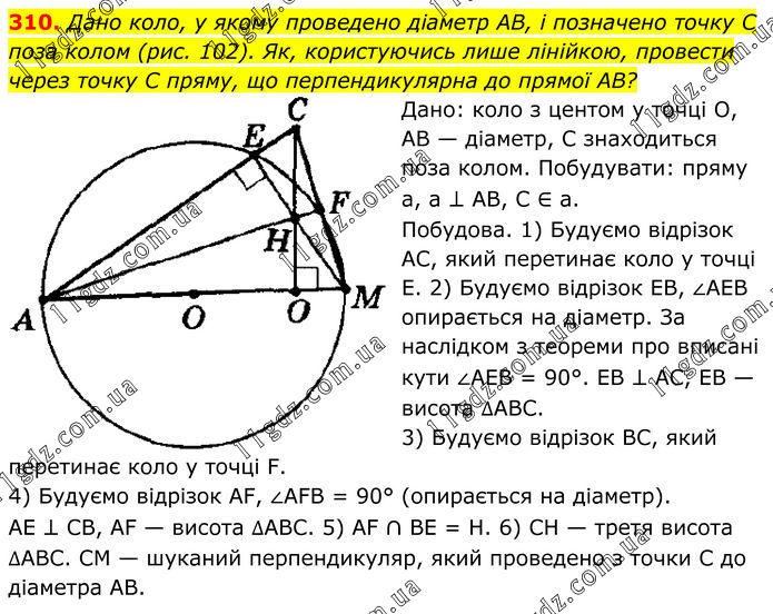 310. Дано коло, у якому проведено діаметр AB, і позначено точку C поза колом (рис. 102). Як, користуючись лише лінійкою, провести через точку C пряму, що перпендикулярна до прямої AВ? Дано: коло з центом у точці О, АВ — діаметр, С знаходиться поза колом. Побудувати: пряму а, а ⊥ АВ, С ∈ а. Побудова. 1) Будуємо відрізок АС, який перетинає коло у точці Е. 2) Будуємо відрізок ЕВ, ∠АЕВ опирається на діаметр. За наслідком з теореми про вписані кути ∠АЕВ = 90°. ЕВ ⊥ АС, ЕВ — висота ∆ABC. 3) Будуємо відрізок ВС, який перетинає коло у точці F. 4) Будуємо відрізок AF, ∠AFB = 90° (опирається на діаметр). АЕ ⊥ СВ, AF — висота ∆ABC. 5) AF ∩ BE = Н. 6) СН — третя висота ∆ABC. CM — шуканий перпендикуляр, який проведено з точки С до діаметра АВ.