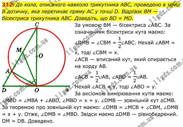312. До кола, описаного навколо трикутника ABC, проведено в точці В дотичну, яка перетинає пряму AC у точці D. Відрізок BM — бісектриса трикутника ABC. Доведіть, що BD = MD. За умовою ВМ — бісектриса ∠ABC. За означенням бісектриси кута маємо: ∠DMB = ∠CBM = 1/2∠ABC. Нехай ∠АВМ = х, тоді ∠CBM = х. ∠АСВ — вписаний кут, який опирається на хорду AB. ∠АСВ = 1/2∪АВ, ∠ABD = 1/2∪АВ. Нехай ∠АСВ = у, тоді ∠АВО = у. За аксіомою вимірювання кутів маємо: ∠МВD = ∠МВА + ∠ABD, ∠МВD = х + у. ∠DМВ — зовнішній кут ∆СМВ. За теоремою про зовнішній кут маємо: ∠DМВ = ∠МСВ + ∠СВМ, ∠DМВ = х + у. Отже, ∠DМВ = ∠МВD. Звідси маємо ∆DМВ — рівнобедрений. DМ = DВ. Доведено.