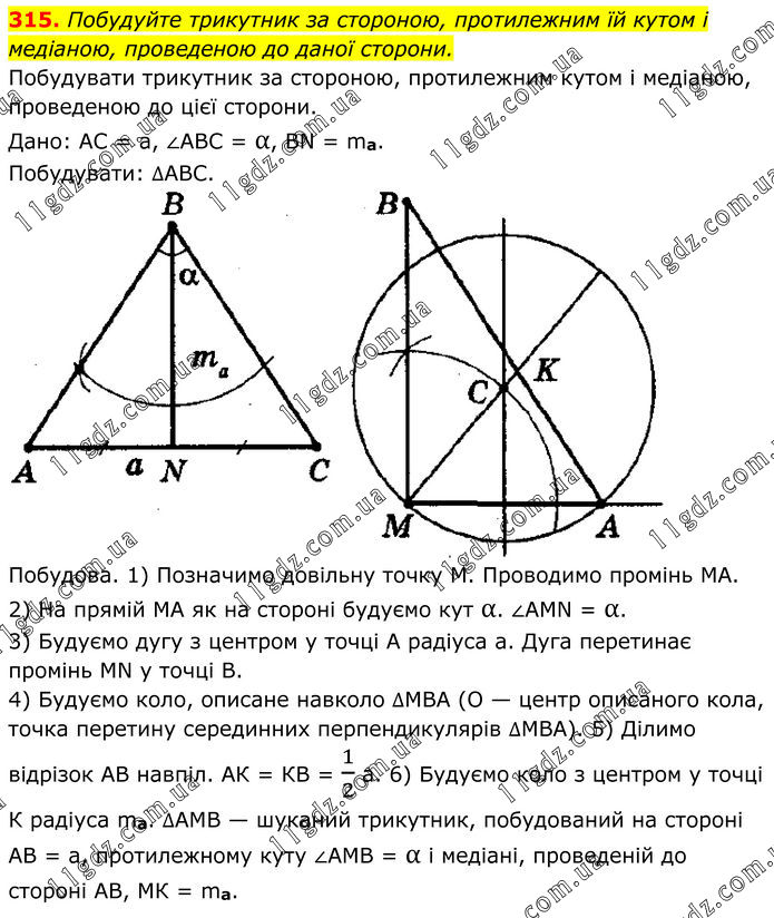 315. Побудуйте трикутник за стороною, протилежним їй кутом і медіаною, проведеною до даної сторони. Побудувати трикутник за стороною, протилежним кутом і медіаною, проведеною до цієї сторони. Дано: АС = а, ∠АВС = α, ВN = mа. Побудувати: ∆АВС. Побудова. 1) Позначимо довільну точку М. Проводимо промінь МА. 2) На прямій МА як на стороні будуємо кут α. ∠AMN = α. 3) Будуємо дугу з центром у точці А радіуса а. Дуга перетинає промінь MN у точці В. 4) Будуємо коло, описане навколо ∆МВА (О — центр описаного кола, точка перетину серединних перпендикулярів ∆МВА). 5) Ділимо відрізок АВ навпіл. АК = КВ = 1/2 а. 6) Будуємо коло з центром у точці К радіуса mа. ∆АМВ — шуканий трикутник, побудований на стороні АВ = а, протилежному куту ∠АМВ = α і медіані, проведеній до стороні АВ, МК = mа.