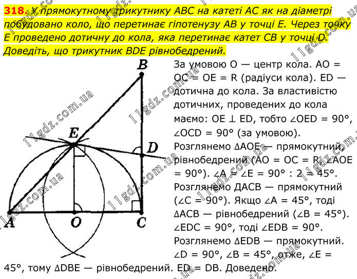 318. У прямокутному трикутнику ABC на катеті AC як на діаметрі побудовано коло, що перетинає гіпотенузу AB у точці Е. Через точку E проведено дотичну до кола, яка перетинає катет CB у точці D. Доведіть, що трикутник BDE рівнобедрений. За умовою О — центр кола. АО = ОС = ОЕ = R (радіуси кола). ЕD — дотична до кола. За властивістю дотичних, проведених до кола маємо: ОЕ ⊥ ЕD, тобто ∠ОЕD = 90°, ∠ОСD = 90° (за умовою). Розглянемо ∆АОЕ — прямокутний, рівнобедрений (АО = ОС = R, ∠АОЕ = 90°). ∠А = ∠Е = 90° : 2 = 45°. Розглянемо ДАСВ — прямокутний (∠С = 90°). Якщо ∠А = 45°, тоді ∆АСВ — рівнобедрений (∠В = 45°). ∠ЕDС = 90°, тоді ∠ЕDВ = 90°. Розглянемо ∆ЕDВ — прямокутний. ∠D = 90°, ∠В = 45°, отже, ∠Е = 45°, тому ∆DВЕ — рівнобедрений. ЕD = DВ. Доведено.