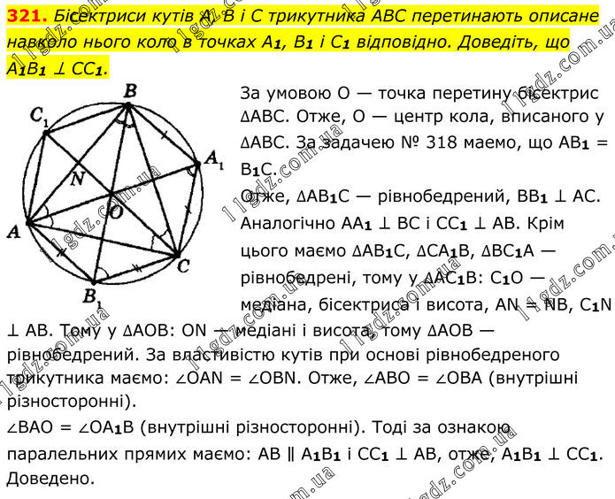 321. Бісектриси кутів А, В і C трикутника ABC перетинають описане навколо нього коло в точках A1, B1 і C1 відповідно. Доведіть, що A1B1 ⊥ CC1. За умовою О — точка перетину бісектрис ∆AВС. Отже, О — центр кола, вписаного у ∆АВС. За задачею № 318 маемо, що АВ1 = В1С. Отже, ∆АВ1С — рівнобедрений, ВВ1 ⊥ АС. Аналогічно АА1 ⊥ ВС і СС1 ⊥ АВ. Крім цього маємо ∆АВ1С, ∆СA1В, ∆ВС1А — рівнобедрені, тому у ∆АC1В: С1O — медіана, бісектриса і висота, АN = NВ, С1N ⊥ АВ. Тому у ∆AОВ: ОN — медіані і висота, тому ∆AОВ — рівнобедрений. За властивістю кутів при основі рівнобедреного трикутника маємо: ∠ОАN = ∠ОВN. Отже, ∠АВО = ∠ОВА (внутрішні різносторонні). ∠ВАО = ∠ОА1В (внутрішні різносторонні). Тоді за ознакою паралельних прямих маємо: АВ ∥ A1В1 і СС1 ⊥ АВ, отже, A1В1 ⊥ СС1. Доведено.
