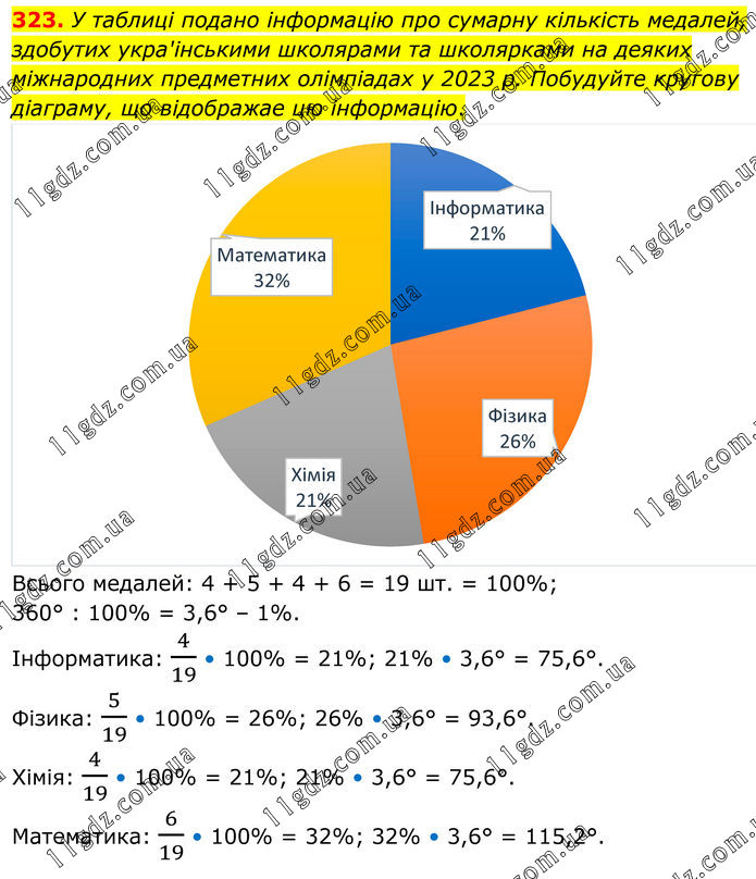 323. У таблицi подано iнформацiю про сумарну кiлькiсть медалей, здобутих укра'iнськими школярами та школярками на деяких мiжнародних предметних олiмпiадах у 2023 р. Побудуйте кругову дiаграму, що вiдображае цю iнформацiю. Всього медалей: 4 + 5 + 4 + 6 = 19 шт. = 100%; 360° : 100% = 3,6° – 1%. Інформатика: 4/19 • 100% = 21%; 21% • 3,6° = 75,6°. Фізика: 5/19 • 100% = 26%; 26% • 3,6° = 93,6°. Хімія: 4/19 • 100% = 21%; 21% • 3,6° = 75,6°. Математика: 6/19 • 100% = 32%; 32% • 3,6° = 115,2°.