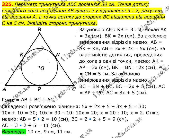325. Периметр трикутника ABC дорівнює 30 см. Точка дотику вписаного кола до сторони AB ділить її у відношенні 3 : 2, рахуючи від вершини А, а точка дотику до сторони BC віддалена від вершини C на 5 см. Знайдіть сторони трикутника. За умовою АК : КВ = 3 : 2. Нехай АК = 3x (см), ВК = 2х (см). За аксіомою вимірювання відрізків маємо: АВ = АК + КВ, АВ = Зх + 2х = 5х (см). За властивістю дотичних, проведених до кола з однієї точки, маємо: АК = АР = Зх (см), ВК = ВN = 2х (см), РС = СN = 5 см. За аксіомою вимірювання відрізків маємо: ВС = ВN + NC, ВС = 2х + 5 (см), АС = АР + РС, АС = Зх + 5 (см). Р∆ABC = АВ + ВС + АС. Складемо і розв’яжемо рівняння: 5х + 2х + 5 + Зх + 5 = 30; 10x + 10 = 30; 10x = 30 – 10; 10х = 20; х = 20 : 10; х = 2. Отже, маємо: АВ = 5 • 2 = 10 (см), ВС = 2 • 2 + 5 = 9 (см), АС = 3 • 2 + 5 = 11 (см). Відповідь: 10 см, 9 см, 11 см.
