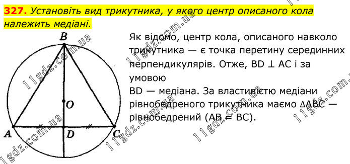 327. Установіть вид трикутника, у якого центр описаного кола належить медіані. Як відомо, центр кола, описаного навколо трикутника — є точка перетину серединних перпендикулярів. Отже, ВD ⊥ АС і за умовою ВD — медіана. За властивістю медіани рівнобедреного трикутника маємо ∆АВС — рівнобедрений (АВ = ВС).