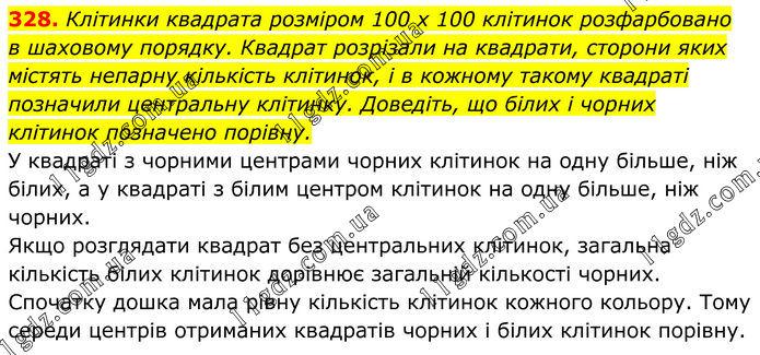 328. Клітинки квадрата розміром 100 х 100 клітинок розфарбовано в шаховому порядку. Квадрат розрізали на квадрати, сторони яких містять непарну кількість клітинок, і в кожному такому квадраті позначили центральну клітинку. Доведіть, що білих і чорних клітинок позначено порівну. У квадраті з чорними центрами чорних клітинок на одну більше, ніж білих, а у квадраті з білим центром клітинок на одну більше, ніж чорних. Якщо розглядати квадрат без центральних клітинок, загальна кількість білих клітинок дорівнює загальній кількості чорних. Спочатку дошка мала рівну кількість клітинок кожного кольору. Тому середи центрів отриманих квадратів чорних і білих клітинок порівну.