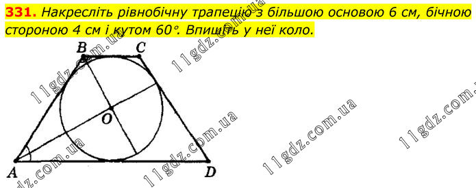 Накресліть рівнобічну трапецію з більшою основою 6 см, бічною стороною 4 см і кутом 60°. Впишіть у неї коло.