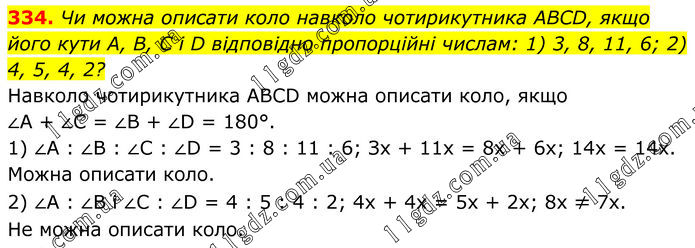 334. Чи можна описати коло навколо чотирикутника ABCD, якщо його кути А, В, C і D відповідно пропорційні числам: 1) 3, 8, 11, 6; 2) 4, 5, 4, 2? Навколо чотирикутника АВСD можна описати коло, якщо ∠A + ∠C = ∠B + ∠D = 180°. 1) ∠A : ∠B : ∠C : ∠D = 3 : 8 : 11 : 6; Зх + 11x = 8x + 6x; 14x = 14х. Можна описати коло. 2) ∠А : ∠В і ∠С : ∠D = 4 : 5 : 4 : 2; 4x + 4х = 5х + 2х; 8х ≠ 7х. Не можна описати коло.