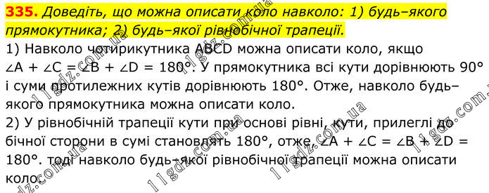 335. Доведіть, що можна описати коло навколо: 1) будь–якого прямокутника; 2) будь–якої рівнобічної трапеції. 1) Навколо чотирикутника АВСD можна описати коло, якщо ∠A + ∠C = ∠B + ∠D = 180°. У прямокутника всі кути дорівнюють 90° і суми протилежних кутів дорівнюють 180°. Отже, навколо будь–якого прямокутника можна описати коло. 2) У рівнобічній трапеції кути при основі рівні, кути, прилеглі до бічної сторони в сумі становлять 180°, отже, ∠A + ∠C = ∠B + ∠D = 180°. тоді навколо будь–якої рівнобічної трапеції можна описати коло.