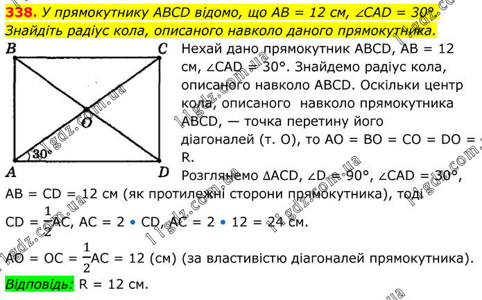 338. У прямокутнику ABCD відомо, що AB = 12 см, ∠CAD = 30°. Знайдіть радіус кола, описаного навколо даного прямокутника. Нехай дано прямокутник ABCD, АВ = 12 см, ∠CAD = 30°. Знайдемо радіус кола, описаного навколо ABCD. Оскільки центр кола, описаного навколо прямокутника ABCD, — точка перетину його діагоналей (т. О), то АО = ВО = СО = DO = R. Розглянемо ∆ACD, ∠D = 90°, ∠CAD = 30°, АВ = CD = 12 см (як протилежні сторони прямокутника), тоді CD = 1/2АС, АС = 2 • CD, АС = 2 • 12 = 24 см. AO = OC = 1/2AC = 12 (см) (за властивістю діагоналей прямокутника). Відповідь: R = 12 см.