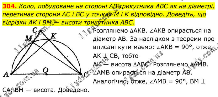 304. Коло, побудоване на стороні AB трикутника ABC як на діаметрі, перетинає сторони AC і BC у точках M i K відповідно. Доведіть, що відрізки AK і BM — висоти трикутника ABC. Розглянемо ∆АКВ. ∠AKB опирається на діаметр АВ. За наслідком з теореми про вписані кути маємо: ∠AKB = 90°, отже, АК ⊥ СВ, тобто АК — висота ∆ABC. Розглянемо ∆АМВ. ∠AMB опирається на діаметр АВ. Аналогічно, отже, ∠AMB = 90°, ВМ ⊥ СА, ВМ — висота. Доведено.