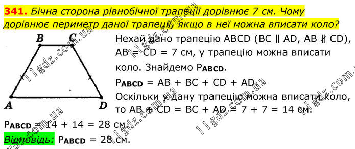 341. Бічна сторона рівнобічної трапеції дорівнює 7 см. Чому дорівнює периметр даної трапеції, якщо в неї можна вписати коло? Нехай дано трапецію АВСD (ВС ∥ АD, АВ ∦ СD), АВ = СD = 7 см, у трапецію можна вписати коло. Знайдемо РАВСD. РАВСD = АВ + ВС + СD + АD. Оскільки у дану трапецію можна вписати коло, то АВ + СD = ВС + АD = 7 + 7 = 14 см. РАВСD = 14 + 14 = 28 см. Відповідь: РАВСD = 28 см.