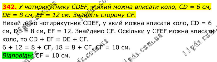 342. У чотирикутнику CDEF, у який можна вписати коло, CD = 6 см, DE = 8 см, EF = 12 см. Знайдіть сторону CF. Нехай дано чотирикутник СDЕF, у який можна вписати коло, СD = 6 см, DЕ = 8 см, EF = 12. Знайдемо СF. Оскільки у СFЕF можна вписати коло, то СD + ЕF = DЕ + СF. 6 + 12 = 8 + СF, 18 = 8 + СF, СF = 10 см. Відповідь: СF = 10 см.